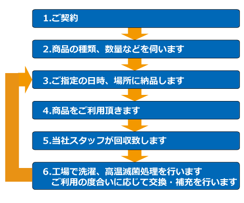 契約が成立しますと、リネンの購入・集配・クリーニング・必要に応じた交換・補充などを当社が一括して行います。お客様は、稼働状況にあわせリネンの発注を当社に行うだけです。